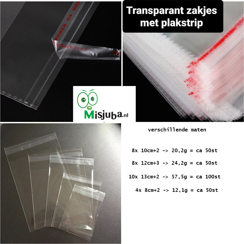 Handige transparante foliezakjes met stevige plakstrip, ideaal voor het netjes en veilig verpakken van diverse artikelen. De zakjes zijn gemaakt van helder kunststof waardoor de inhoud altijd goed zichtbaar blijft. Dankzij de zelfklevende sluiting zijn ze eenvoudig en snel te gebruiken, zonder extra tape of hulpmiddelen.